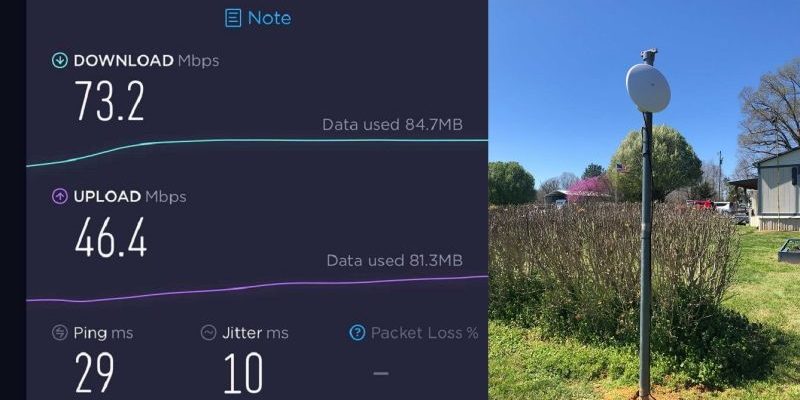 - Third row shows how our customers sometimes need to install a pole on their property in order to get signal. This customer was able to get >70 Mbps download by installing the pole.